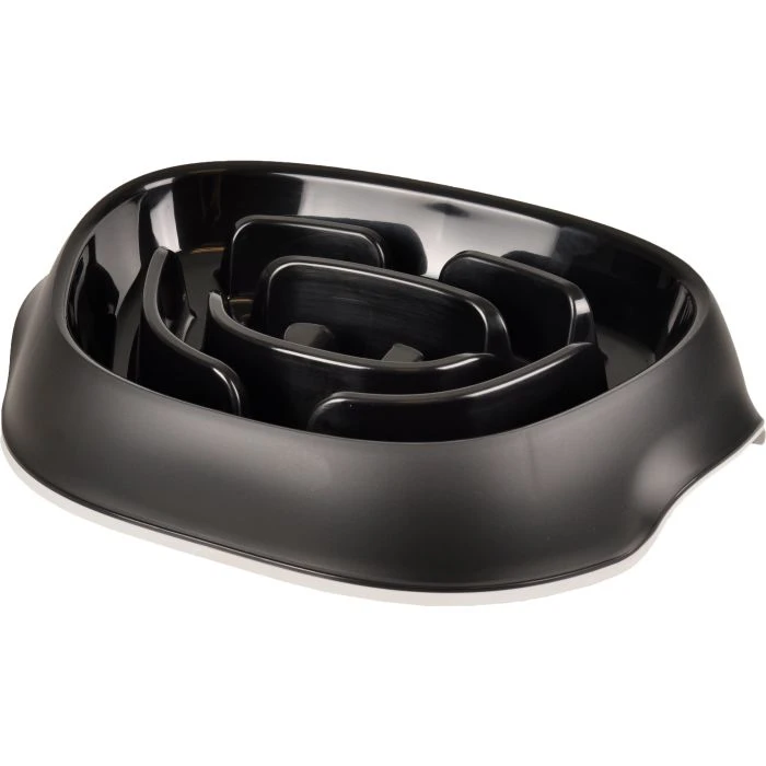 Le Slowfeeder d’Exqi, de couleur noire, comporte des parois verticales, ce qui a pour but d’inciter votre chien ou votre chat à manger moins vite. Le bol est conçu pour que l’animal mange plus lentement et que le repas lui-même devienne une petite aventure. L’anneau antidérapant sous le bol lui permet de ne pas glisser.
