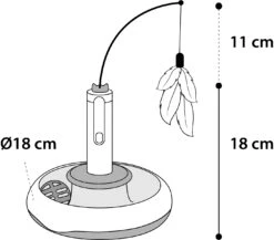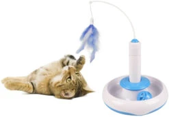 Jouet interactif pour les chats. Contient une boule bleue avec une cloche. Il est motorisé : les ressorts tournent de manière imprévisible dans le sens des aiguilles d’une montre et dans le sens inverse. Vous pouvez enlever la tige avec les plumes pour jouer vous-même avec votre chat. Nécessite 2 piles AAA, non incluses.
