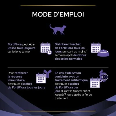 Fortiflora est un supplément probiotique diététique sous forme de poudre appétente à saupoudrer sur les aliments de votre chat, et à utiliser dans les cas suivants :