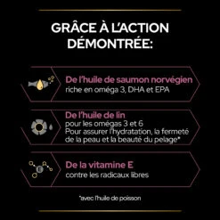 PRO PLAN® a mis au point une gamme d’aliments complémentaires ciblés destinés à agir sur la mobilité, l’immunité, la vitalité, la digestion, la peau & le pelage et le bien-être. PRO PLAN® Skin & Coat+ nourrit la peau et le pelage de votre chat de l’intérieur, grâce à sa formule riche en nutriments essentiels (tels que les acides gras Oméga 3 et 6 issus d’huile de saumon de Norvège, l’huile de lin et la vitamine E). Sa formule est scientifiquement conçu pour : – Soutenir une peau saine, hydratée et souple et un pelage brillant