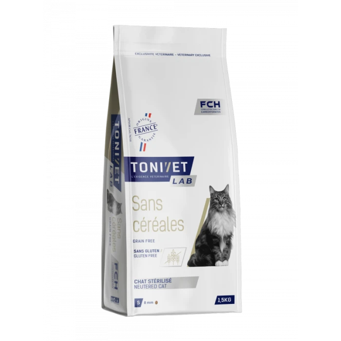Tonivet chat adulte sans céréales possède une formule spécifique pour répondre aux besoins des chats adultes sensibles aux céréales et au gluten. Son taux élevé de protéines d’origine animale de haute qualité 81% (poulet, truite, saumon, œuf) combiné à des sources alternatives de glucides en font un aliment hautement digestible.