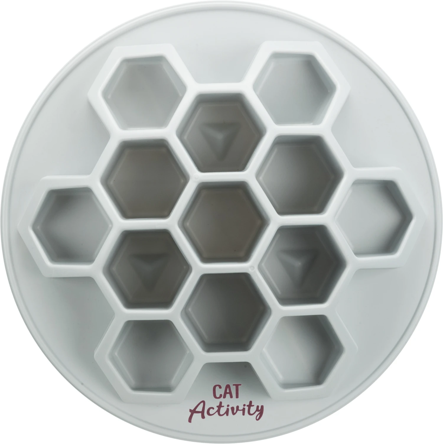 Le Trixie Cat Activity Snack Hive XXL Light Grey 35 x 35 cm est un jeu stimulant pour les chats, particulièrement adapté aux gros chats, où ils peuvent pêcher leur récompense avec dextérité. Cette amusante ruche à friandises est faite de plastique robuste et comporte des trous en forme de nid d’abeille. Les trous contiennent la récompense de votre chat ou sa nourriture habituelle, il doit ensuite utiliser sa dextérité pour les attraper. Cela réduit l’ennui et procure une stimulation mentale, et convient particulièrement aux chats qui ont tendance à trop manger : vous pouvez également utiliser la Ruche pour la nourriture sèche quotidienne ! La ruche est fabriquée en plastique et est facile à nettoyer. Elle est équipé en dessous d’un anneau en caoutchouc, qui l’empêche de glisser pendant les jeux et les repas.